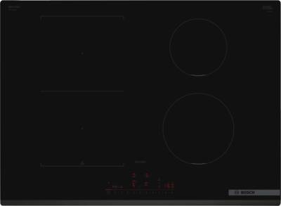 Inductie kookplaat, Bediening voorzijde, DirectSelect, 4 Kookzones, Combinatiezones: 1, bruikbaar als twee aparte of één grote kookzone, Panherkenning, 17 Standen, PerfectFry, Power Managment, QuickStart, PowerBoost, Favorieten knop, Pauze functie, ReStart, Timer, Facet geslepen, Home Connect (bediiening via Smartphone of Tablet mogelijk), netto breedte: 71 cm, netto hoogte: 5,1 cm, netto diepte: 52,2 cm
