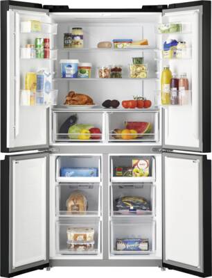 Multidoor/ Frenchdoor, Vierdeurs, Gezamenlijke inhoud koelen en vriezen: 474l, 305 l Inhoud koelgedeelte, Automatisch ontdooisysteem koelgedeelte, Superkoelen, 1, 3 Glasplateaus, 1 Groentelade(n), LED verlichting, 169 l Inhoud vriesgedeelte, legvlakken: 2, 4 Lade, NoFrost, Supervriezen, Digitale temperatuurweergave, Energieklasse D, netto breedte: 83,3 cm, netto hoogte: 177,5 cm, netto diepte: 65,3 cm