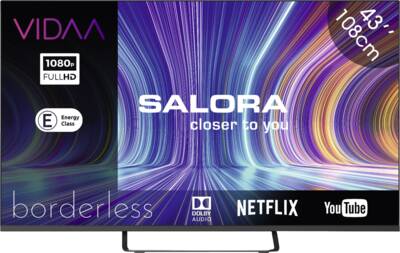 109,2cm LED televisie, 43 inch, resolutie: 1.920×1.080 pixels, Full HD, LED-Backlight, Response Time: 6,5 ms, ontvangst DVB-T2, DVB-S2, DVB-C, 2.0 Soundsysteem, 8 Watt maximaal Gezamenlijk vermogen, Via app te bedienen, SmartTV, VIDAA U, USB-Recording, WLAN, Energieklasse E