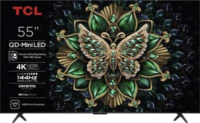 140cm LED televisie, 55 inch, resolutie: 3.840×2.160 pixels, 4K resolutie, 4K AI Upscaling, 10 Bit ondersteuning, H.265 HEVC, QLED-Panel, QLED-Technologie, QD Mini LED, High Dynamic Range (HDR 10), High Dynamic Range (HDR 10+), Hybrid Log Gamma (HLG), Dolby Vision IQ, 144 Hz-Technologie, Motion Clarity, Picture Performance Index [PPI]: 4.100, DVB-T2, DVB-S2, DVB-C, 2.1 Soundsysteem, Dolby Atmos, 20 Watt maximaal Gezamenlijk vermogen, Via app te bedienen, SmartTV, Google, AMD FreeSync Premium Pro, WEB-Browser, Chromecast built-in, WLAN, Energieklasse F